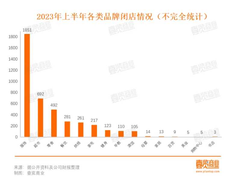 據(jù)壹覽商業(yè)不完全統(tǒng)計(jì),2023年上半年實(shí)體零售中有至少4181家實(shí)體店沒能進(jìn)入到下半年。從閉店業(yè)態(tài)來(lái)看其中超市便利店692家、百貨購(gòu)物中心14家、服飾1851家、餐飲相關(guān)564家、其他行業(yè)1060家。